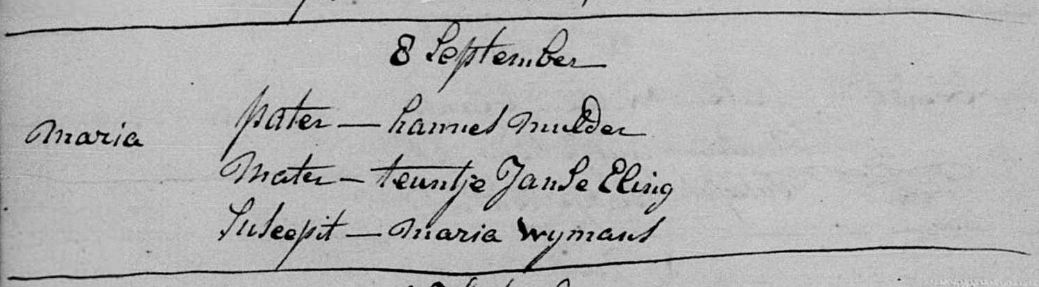 Maria Mulder, dochter van Johannes Mulder en Antonia Eeling, gedoopt 8 september 1790 RK ’t Zand (get: Maria Wijmans) (#), overleden 17 februari 1850 te Amersfoort (#)