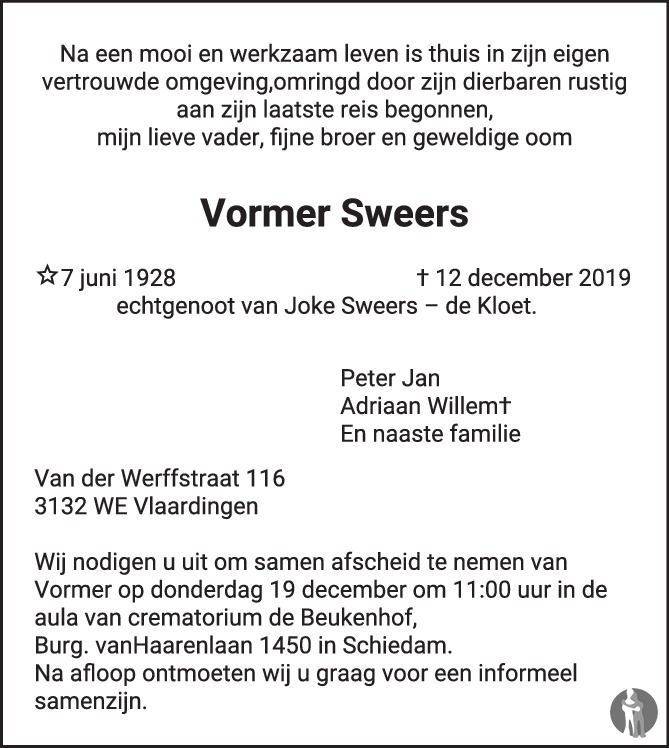 4.2.8.12.1.4.5.3.1 Vormer Sweers, geboren 7 juni 1928 te Amsterdam, overleden 12 december 2019, gecremeerd 19 december 2019 in crematorium Beukenhof te Schiedam (#)
