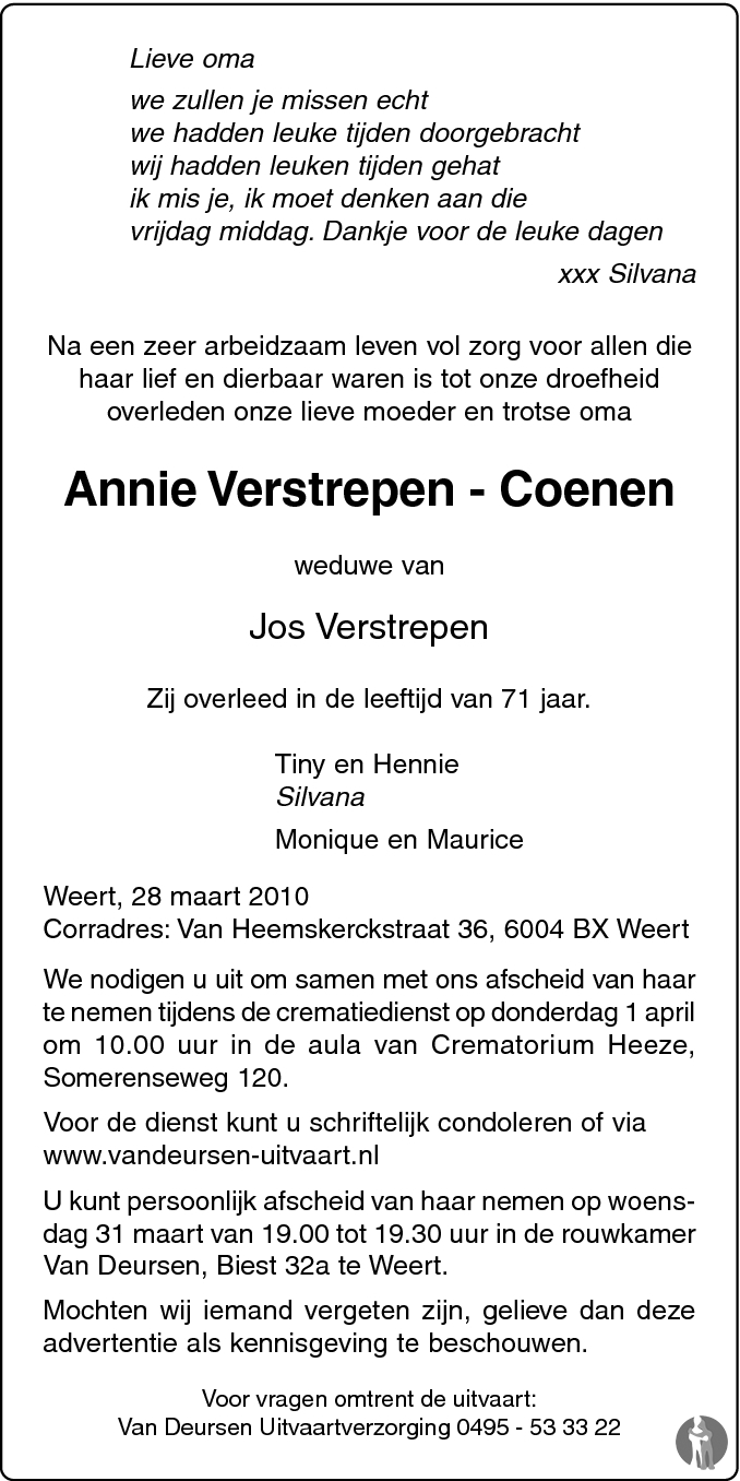 3.3.3.1.6 Johannes Verstrepen, dochter van Johannes Matthijs Verstrepen en Alida Catharina Maria Brouwer, geboren 1 december 1937 te Breda, overleden 1 april 1981 te Weert. Gehuwd met Annie Coenen, geboren 1938-1939, overleden 28 maart 2010 te Weert, gecremeerd 1 april 2010 in Crematorium Heeze (#)