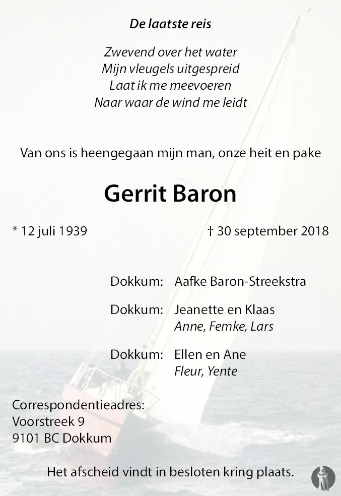 4.1.4.1.1.1 Gerrit Baron, geboren 12 juli 1939 te Dokkum, overleden 30 september 2018 (#). Gehuwd op 7 april 1964 te Ternaard met <Anoniem>