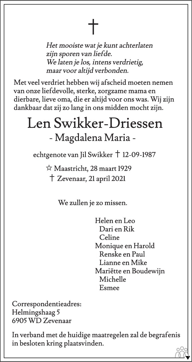 3.3.3.2.2 Jillis Adrianus Maria Swikker, luitenant-kolonel bij de Koninklijke Luchtmacht, zoon van Anthonius Theodorus Swikker en Maria Geertruida Brouwer, geboren 25 mei 1929 te Utrecht, overleden 12 september 1987 te Zevenaar, begraven 16 september 1987 op begraafplaats Rosorum te Zevenaar (#). Gehuwd met Magdalena Maria Driessen, geboren 28 maart 1929 te Maastricht, overleden 21 april 2021 te Zevenaar, begraven op begraafplaats Rosorum te Zevenaar (#)