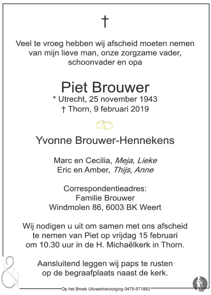 3.3.3.7.4 Pieter Brouwer, zoon van Pieter Brouwer en Maria Johanna Antonia Agterberg, geboren 25 november 1943 te Utrecht, overleden 9 februari 2019 te Thorn, begraven op de begraafplaats bij de H. Michaelkerk te Thorn (#). Gehuwd op 15 oktober 1970 te Geleen met <Anoniem>