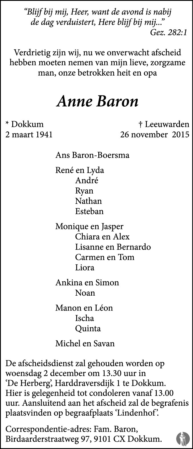 4.1.4.1.1.2 Anne Baron, geboren 2 maart 1941 te Dokkum, overleden 26 november 2015 te Leeuwarden, begraven 2 december 2015 te Dokkum (#). Gehuwd op 27 december 1976 te Kollum met <Anoniem>